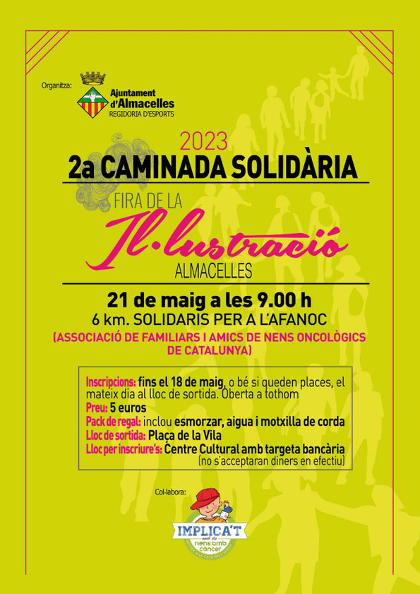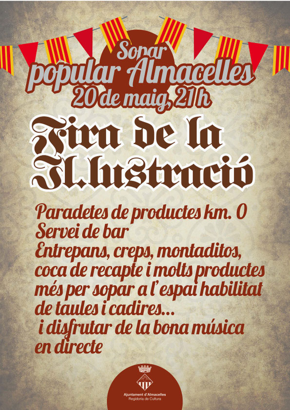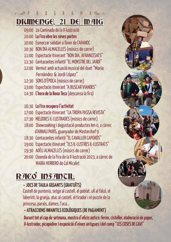 20 y 21 de mayo de 2023 Almacelles torna a reivindicar els seus orígens amb la VIII Fira de la Il.lustració juntament amb la IV Fira Tasta'm i mostrarà una amplíssima oferta d'expositors, artesans, espectacles i actuacions per a tothom